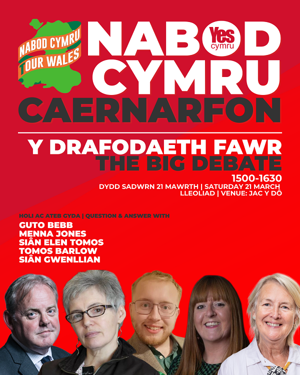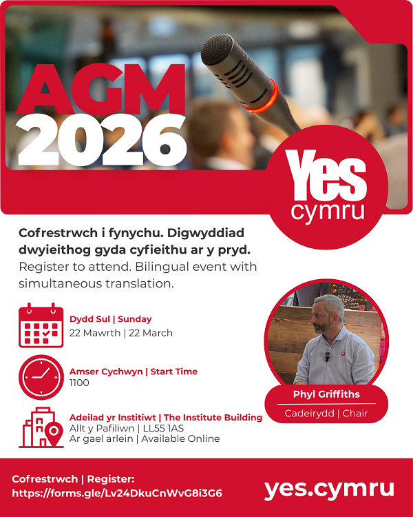 - 11:00 – Cyfarfod Cyffredinol Blynyddol YesCymru 2026. Dwyieithog - Cyfieithu ar y pryd. Adeilad yr Institiwt, Allt y Pafiliwn, LL55 1AS (neu ar-lein). Cofrestrwch i fynychu - https://forms.gle/Lv24DkuCnWvG8i3G6.